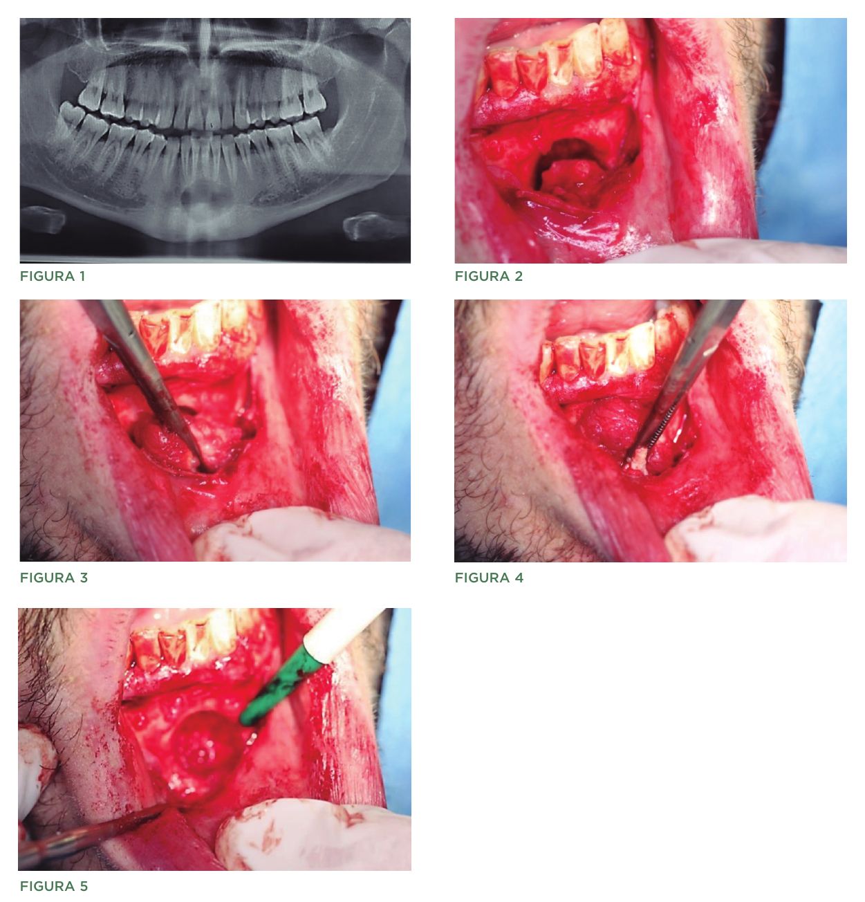 Tratamiento de un quiste radicular. Quistectomía, apicectomías de los dientes afectados y regeneración ósea guiada