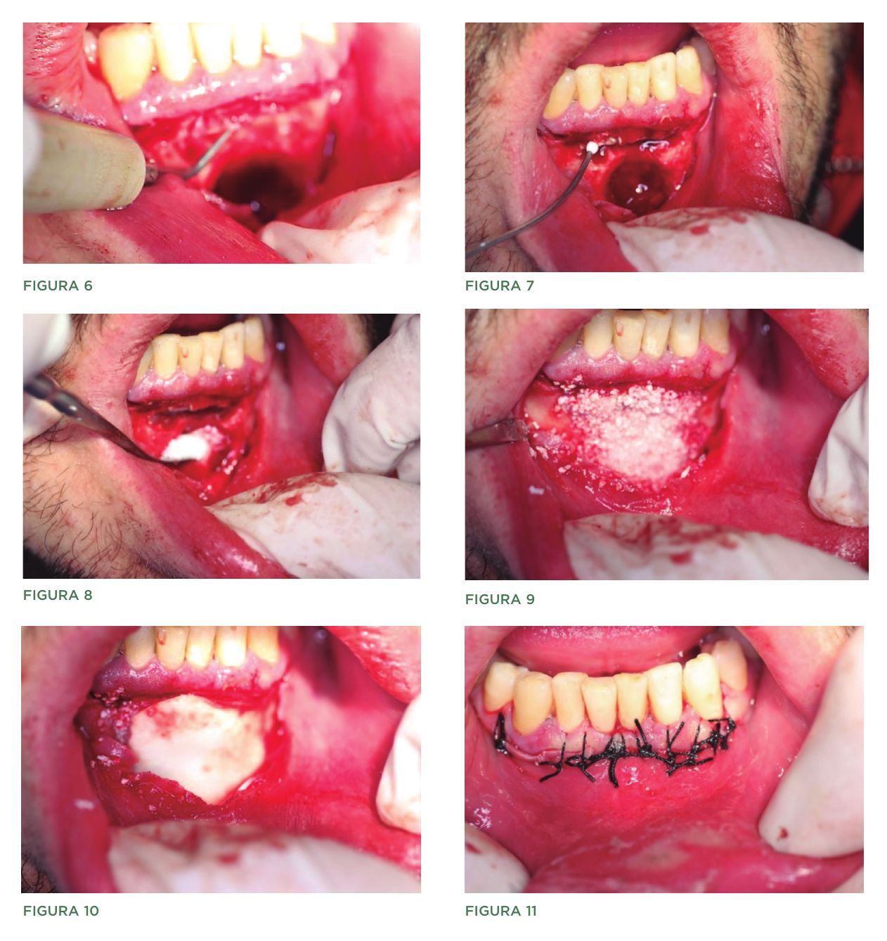 Por último, realizamos la regeneración ósea guiada en la zona del defecto, mediante la utilización de hueso particulado y una membrana de colágeno reabsorbible, efectuando el cierre del colgajo con una sutura de seda de 3-0 (Figuras 8-11).