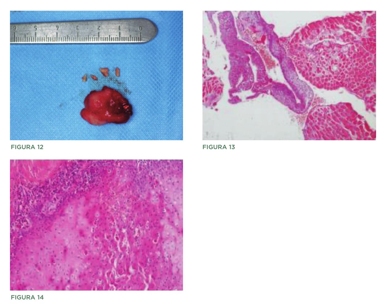 La lesión extirpada fue enviada al laboratorio de anatomía patológica para su estudio (Figura 12). El informe histopatológico recibido confirmó el diagnóstico de lesión compatible con quiste odontogénico, detallando en su descripción macroscópica que el material remitido era un fragmento irregular de tejido que medía 2,5 x 2 cm de diámetros mayores, siendo de coloración blancogrisácea a la sección y de consistencia elástica. En su descripción microscópica, se identificó abundante tejido fibroso colagenizado, observándose en su espesor fragmentos aislados de epitelio escamoso ordenado y maduro, apreciando además moderado infiltrado inflamatorio de tipo linfoplasmocitario, así como hemosiderófagos (Figuras 13-14).